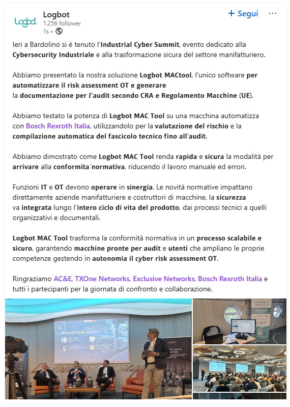 L’evento ha visto la partecipazione di realtà come AC&E, TXOne Networks, Bosch Rexroth, Exclusive Networks e Logbot, con l’obiettivo di creare un momento di confronto tra competenze tecniche, normative e organizzative.